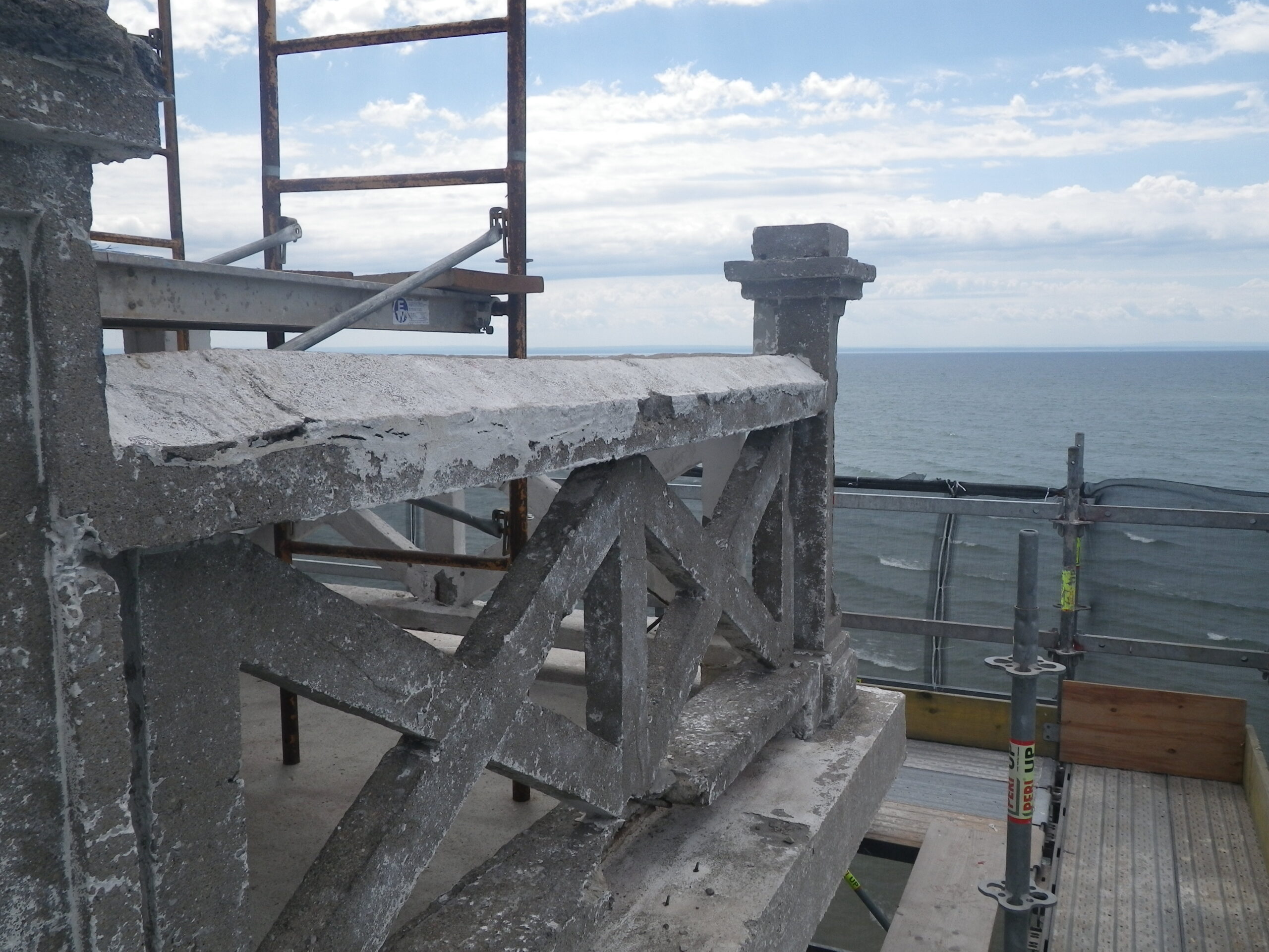 To address these challenges, we constructed a weather-tight scaffold enclosure, allowing work to continue safely regardless of weather conditions. We implemented a fast-track schedule, using mock-ups to verify historical accuracy and enabling early adjustments as needed. Prefabricated forms were crafted to match the original concrete patterns precisely, ensuring that the restoration remained true to the lighthouse’s historical integrity.